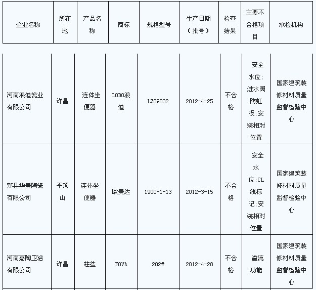 河南省质量技术监督局日前通报卫生陶瓷产品质量省监督检查结果,有6批次产品质量不符合标准要求。有6批次产品质量不符合标准要求,涉及河南浪迪瓷业有限公司、郏县华美陶...
