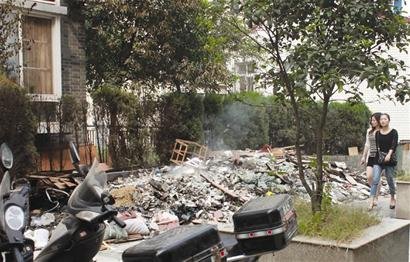 两度失火的垃圾堆 楼外成堆的装修垃圾,半夜两次燃烧并惊动消防