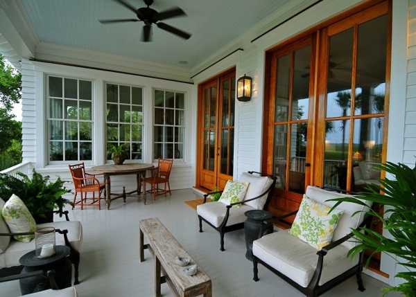 3.黑色铁艺沙发放在户外,白色坐垫成为家里最好的休闲区。挂着的盆栽和鲜绿色植物使阳台更加分散。在忙碌的生活中,一杯咖啡和一本书可以让你在这个阳台上度过一个美丽的下午。