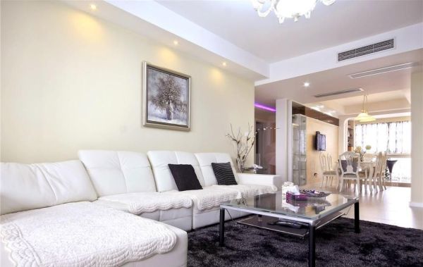1.虽然它是一个小家庭,但装饰看起来并不拥挤。整个空间主要是白色的,白色的地砖和白色的沙发,看起来很明亮。茶几下精致图案的地毯已成为白色客厅的亮点。
