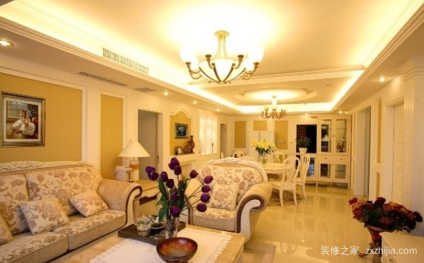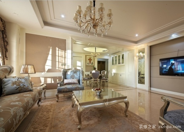 中间的茶几和周围的沙发组属于复古的欧式风格。深金色的画面搭配直白色,古典气息扑面而来,不显得沉重压抑。