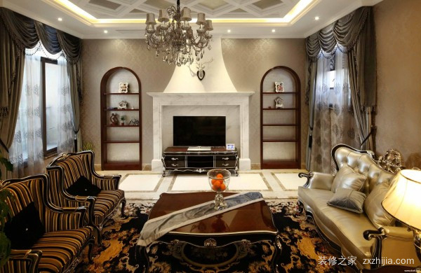 用典型的欧洲木材制成的茶几和后壁炉似乎回到了古老的欧洲。两排书架便于在客厅阅读和使用,也起到了很好的装饰作用。